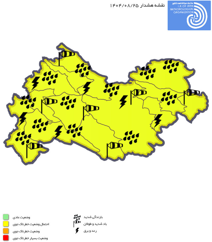 توصیف وضعیت جوی: موجی ناپایدار در روزهای شنبه و یکشنبه هفته آینده، افزون بر تشدید وزش باد همراه با گردوخاک محلی و تعدیل دمای هوا (کاهش دمای روزانه و افزایش نسبی دمای شبانه) به تناوب بارشهایی احتمالاً همراه با رعدوبرق، بخصوص برای نیمه غربی و مناطق شمالی استان در پی خواهد داشت.