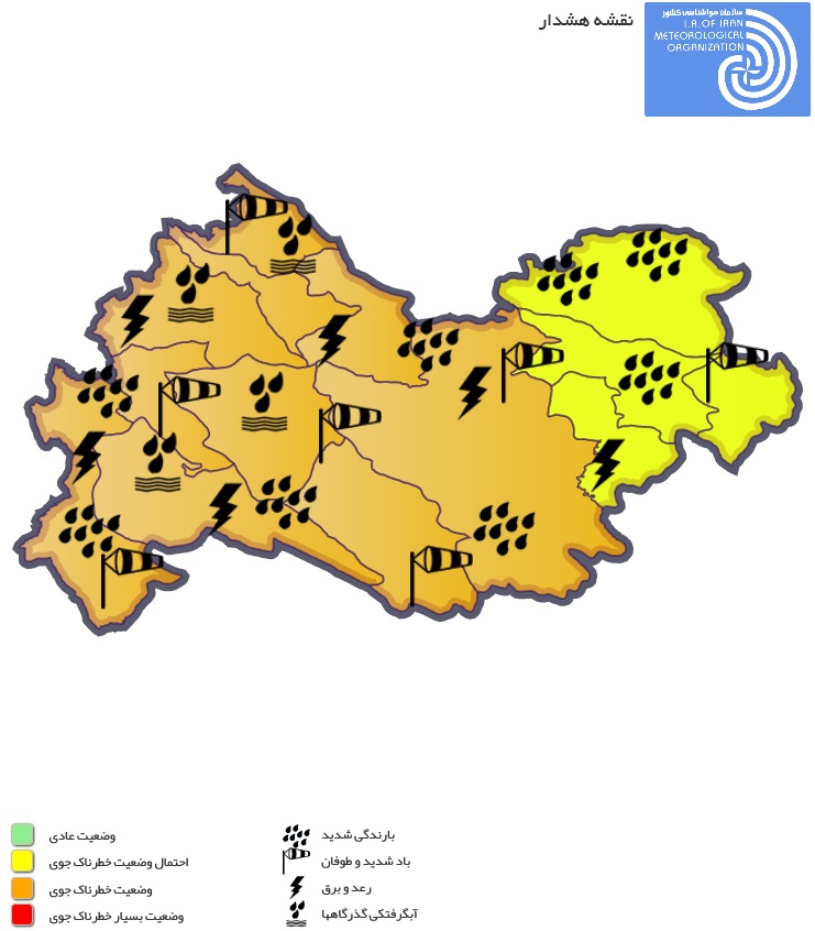مخاطرات: بارندگی، وزش باد، رعدوبرق و احتمالاً تگرگ