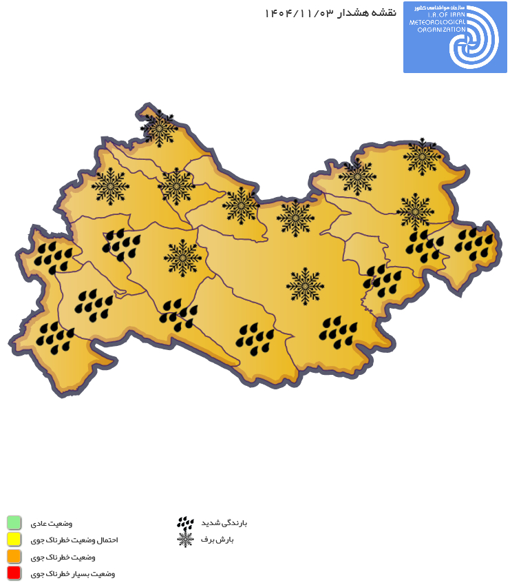 مخاطرات: بارش باران و برف، در برخی نقاط مه