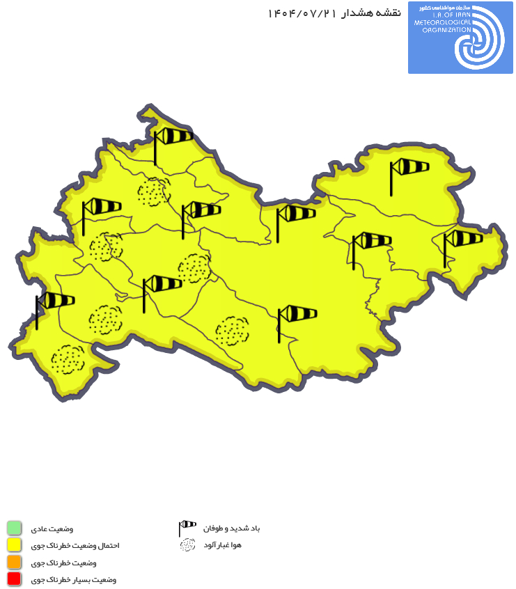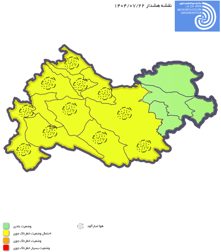 توصیف وضعیت جوی: موجی ناپایدار طی امشب و فردا (دوشنبه) از جو منطقه عبور میکند. این موج، ضمن افزایش نسبی دمای شبانه، در بعضی ساعات وزش باد نسبتاً شدید و گردوخاک محلی، در ساعاتی از عصر فردا تا ظهر سه شنبه، هوا را در نیمه غربی استان، بخصوص مناطق مرزی نسبتاً غبارآلود خواهد کرد.