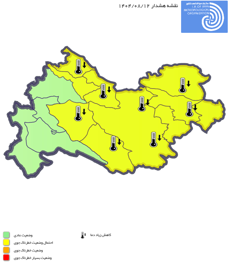 توصیف وضعیت جوی: با ریزش تدریجی جریانهای نسبتاً سرد شمالی در جو منطقه، متوسط دمای هوا (بویژه حداقل دمای شبانه) تا روز سهشنبه 13 آبان، در غالب نقاط استان به آرامی کاهش مییابد. کاهش دما در روزهای دوشنبه و سه شنبه محسوس تر بوده پیش بینی می شود؛ کمینه دمای هوا تا روز سه شنبه، به طور غالب بین 3 تا 5 درجه سانتیگراد در نقاط مختلف استان کاهش یابد.