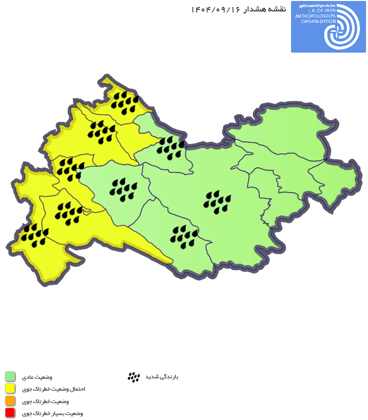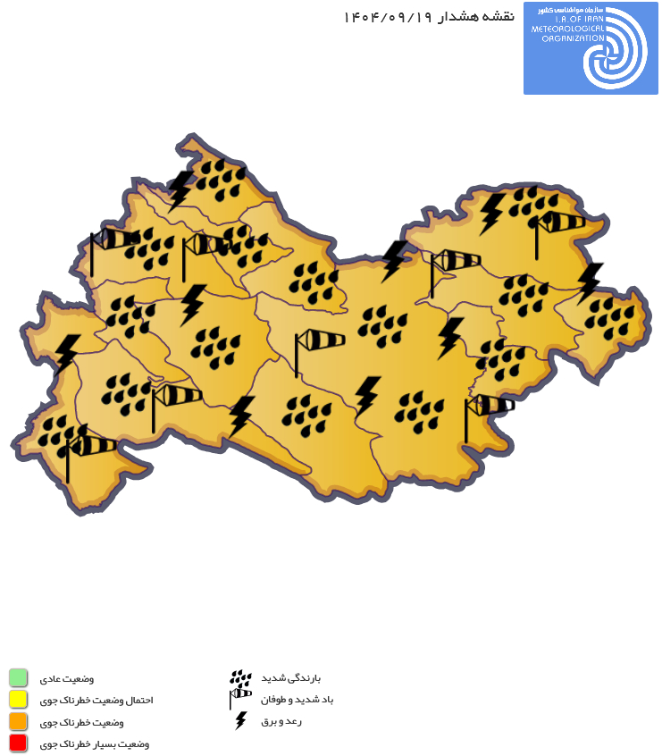 توصیف وضعیت جوی: سامانه بارشی قدرتمندی از اواخر وقت فردا (یکشنبه) تا پایان هفته، به تناوب جو استان را تحت تاثیر قرار داده در مجموع بارشهای قابل توجهی برای سطح استان در پی خواهد داشت. بیشینه فعالیت این سامانه در روزهای دوشنبه تا چهارشنبه و در نواحی شمالغرب و غرب استان متمرکز خواهد بود. بارش، که در بعضی ساعات با رعدوبرق و احتمالاً رگبار پراکنده تگرگ نیز همراه میگردد؛ علاوه بر آبگرفتگی معابر عمومی و رواناب، ممکن است در برخی مناطق یادشده، سبب سیلابهای محلی شود.